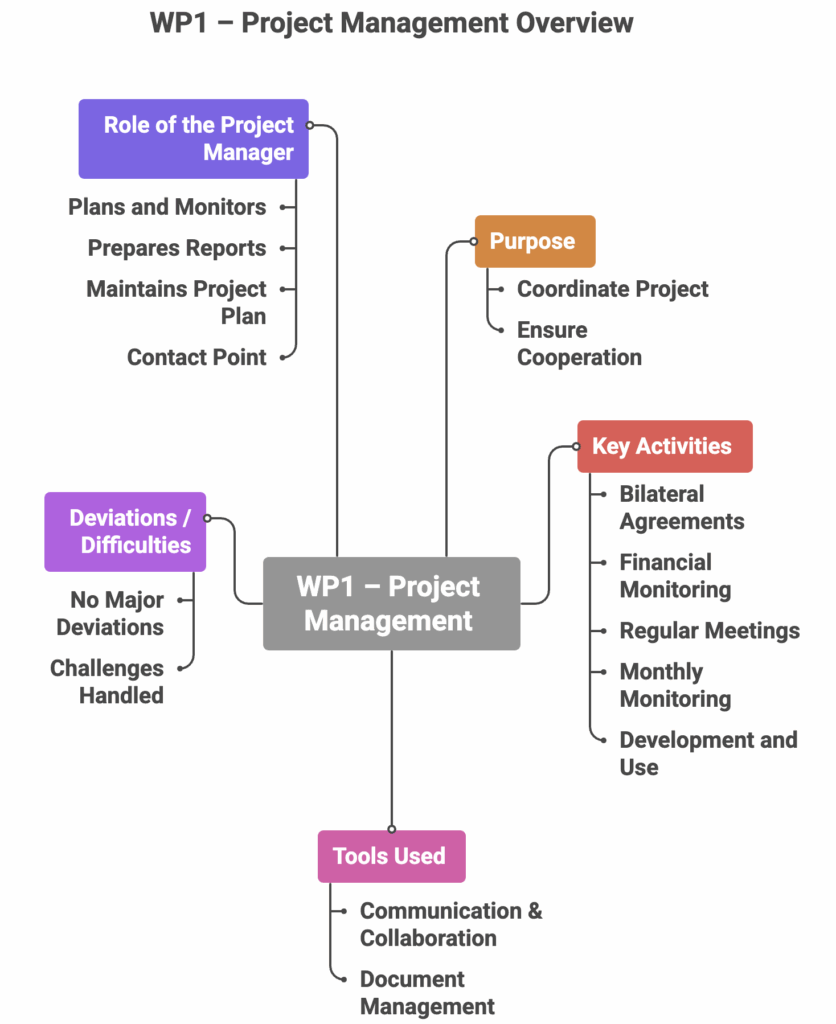 WP1’s goal is Project management and budget control of the project. The management structure for monitoring activities: I): Project Steering Committee (PSC) – Project management activities on the top-level – Transnational II): National Advisory Board (NAB) – Overall monitoring of the project implementation – National: External team from each partners country, with one member from the project team III): Monitoring and Evaluation Committee (MEC) – Tracking and monitoring of the project implementation, i.e., mostly qualitative and quantitative indicators – National.