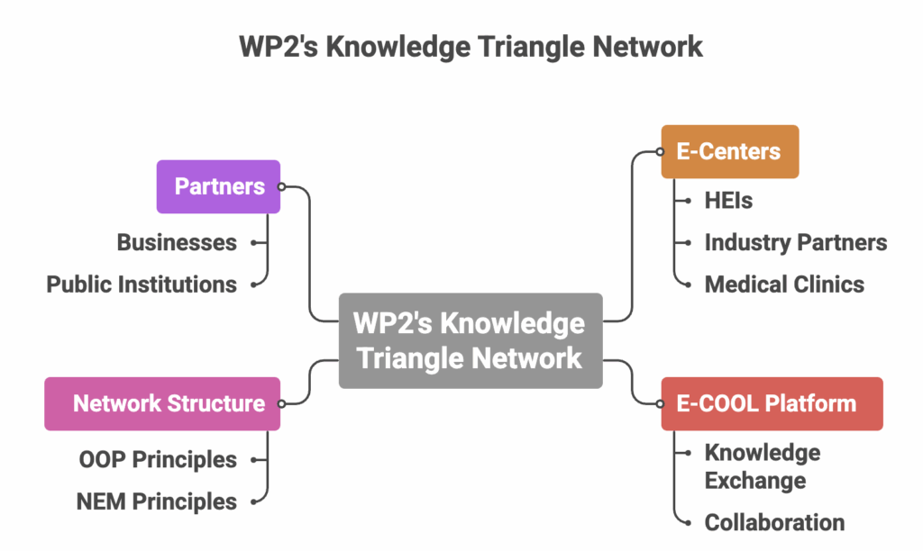 WP2’s goal is to establish a network for medical engineering and education, promoting knowledge exchange and collaboration primarily among Higher Education Institutions (HEIs), businesses, and public institutions. This Knowledge Triangle Network features E-Centers, including HEIs, industry partners, and medical clinics, potentially extending to research centers and public/private institutions. The network’s unique structure and connections are created using innovative in-house methods.